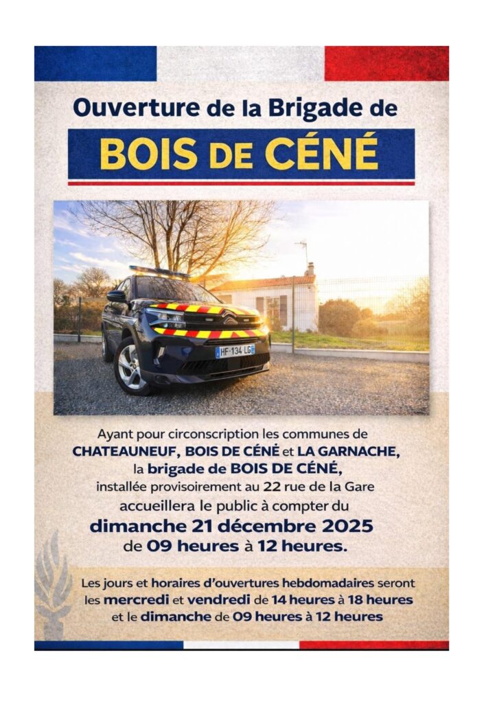 Dès le 21 décembre 2025, la nouvelle brigade de gendarmerie de Bois-de-Céné ouvrira officiellement son accueil au public !